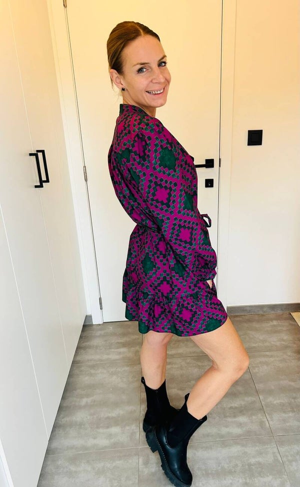 Patronenkleedje met groene tekening met lint , is 1 maat goed voor maat 36 tot kleine 42